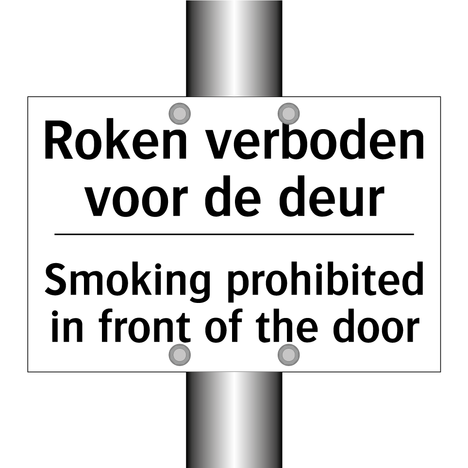 Verbodsbord met de tekst Roken verboden voor de deur en in het Engels: Smoking prohibited in front of the door