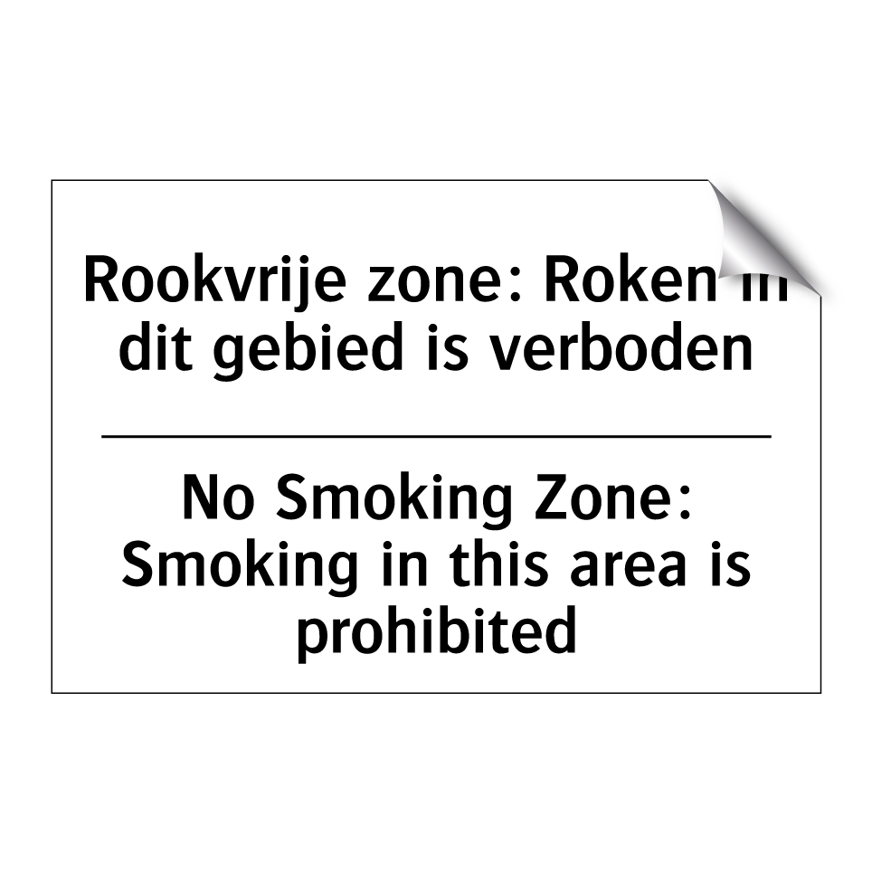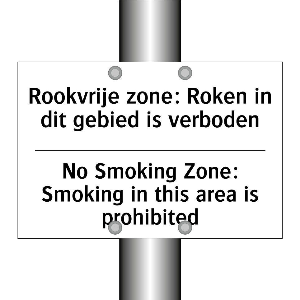 Verbodsbord met de tekst Rookvrije zone: Roken in dit gebied is verboden en in het Engels: No Smoking Zone: Smoking in this area is prohibited