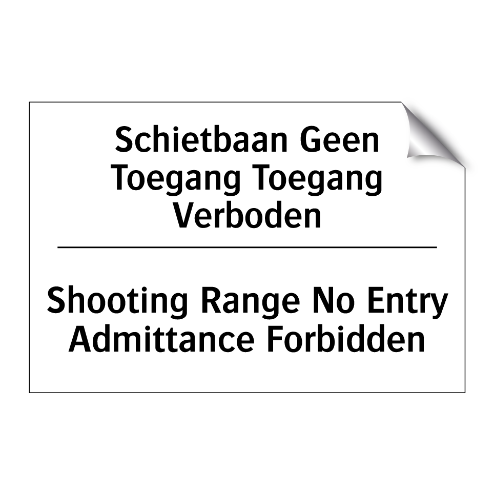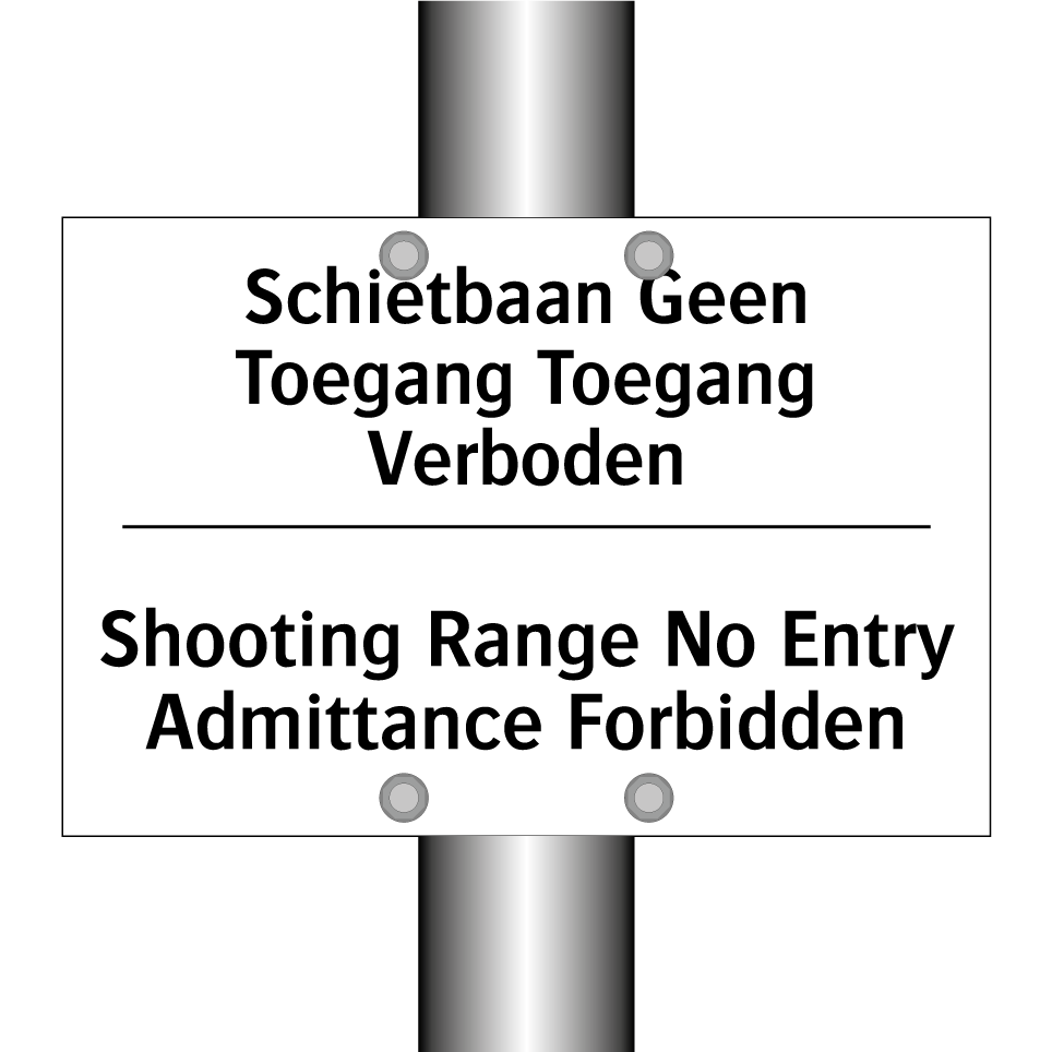 Verbodsbord met de tekst Schietbaan Geen Toegang Toegang Verboden en in het Engels: Shooting Range No Entry Admittance Forbidden
