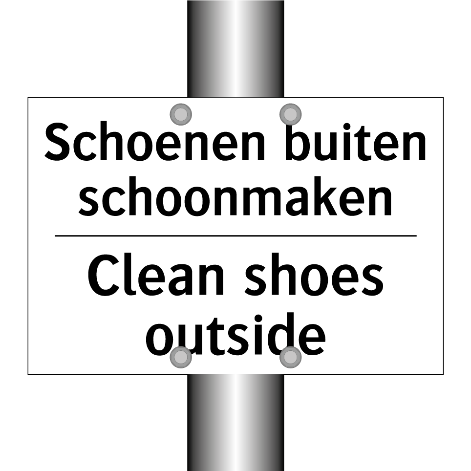 Verbodsbord met de tekst Schoenen buiten schoonmaken en in het Engels: Clean shoes outside