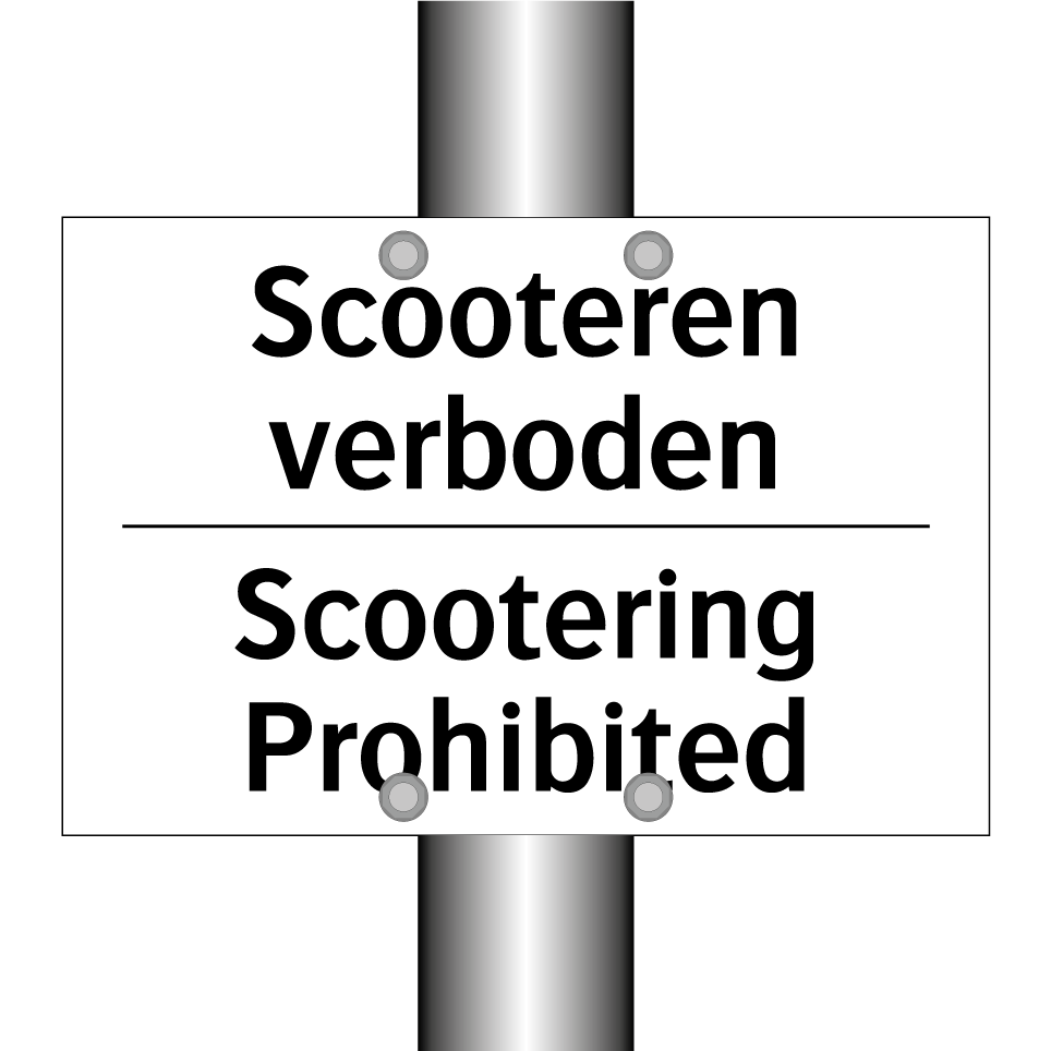 Verbodsbord met de tekst Scooteren verboden en in het Engels: Scootering Prohibited