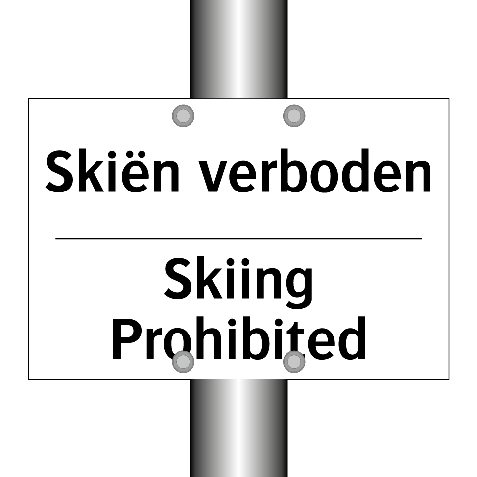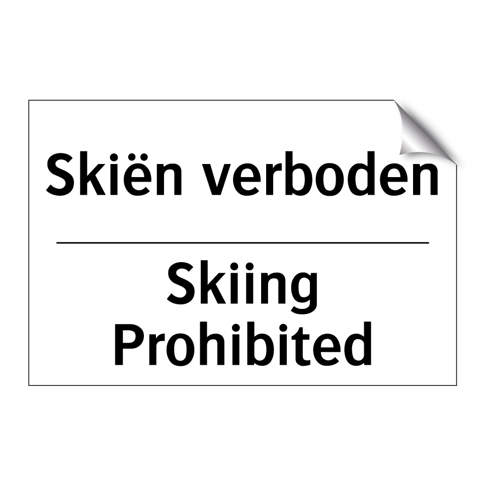 Verbodsbord met de tekst Skiën verboden en in het Engels: Skiing Prohibited