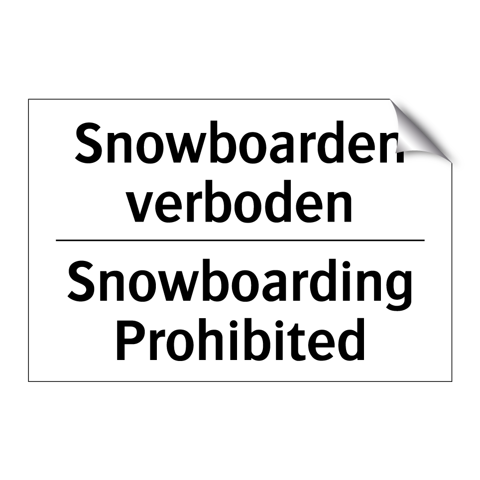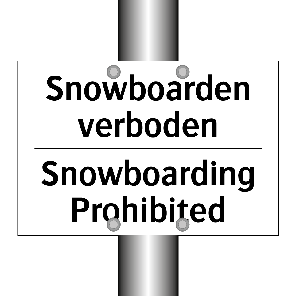 Verbodsbord met de tekst Snowboarden verboden en in het Engels: Snowboarding Prohibited