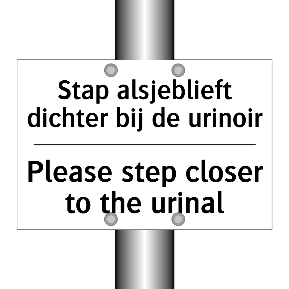Verbodsbord met de tekst Stap alsjeblieft dichter bij de urinoir en in het Engels: Please step closer to the urinal
