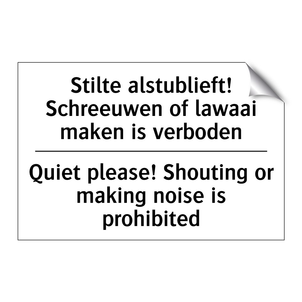 Verbodsbord met de tekst Stilte alstublieft! Schreeuwen of lawaai maken is verboden en in het Engels: Quiet please! Shouting or making noise is prohibited