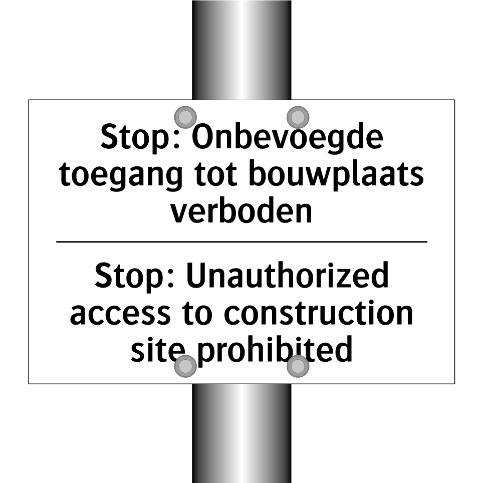 Verbodsbord met de tekst Stop: Onbevoegde toegang tot bouwplaats verboden en in het Engels: Stop: Unauthorized access to construction site prohibited
