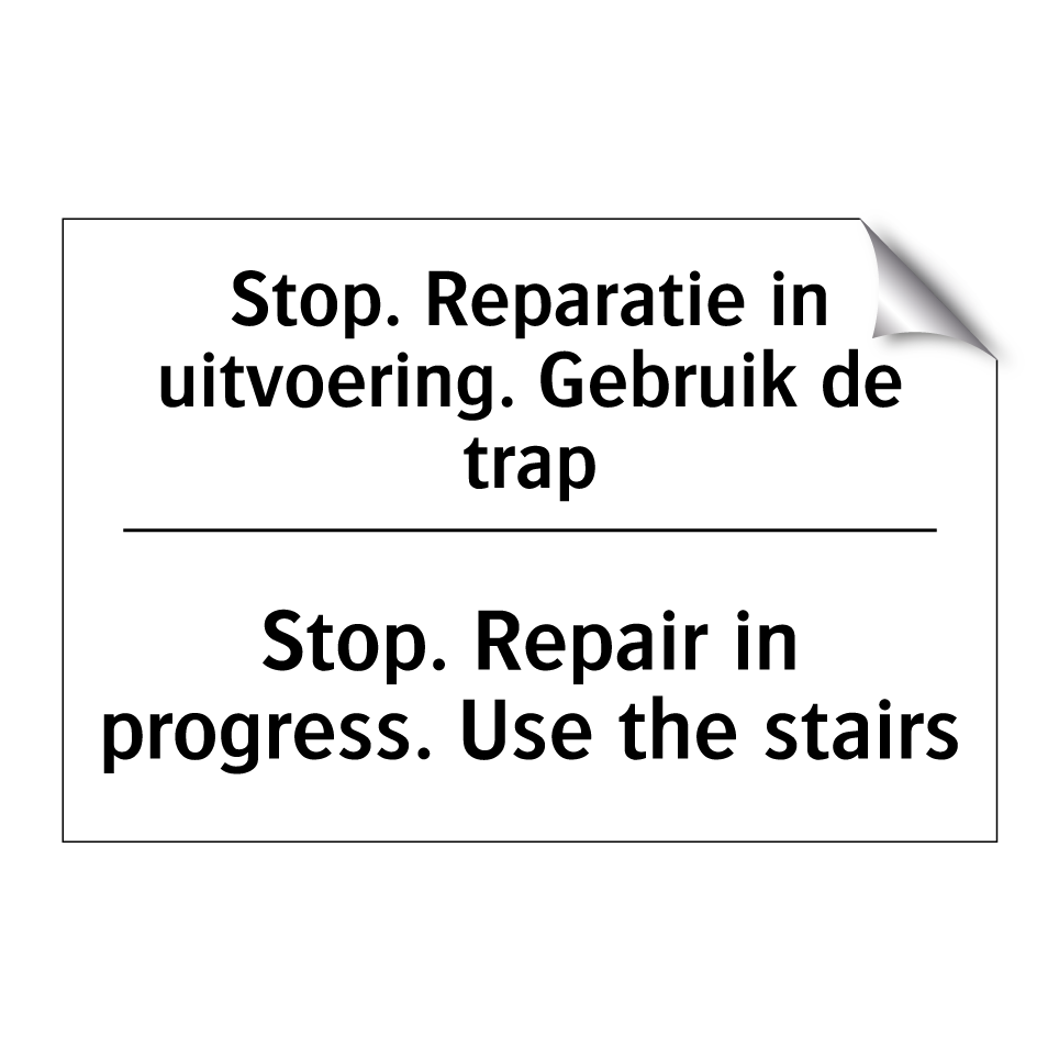 Verbodsbord met de tekst Stop. Reparatie in uitvoering. Gebruik de trap en in het Engels: Stop. Repair in progress. Use the stairs