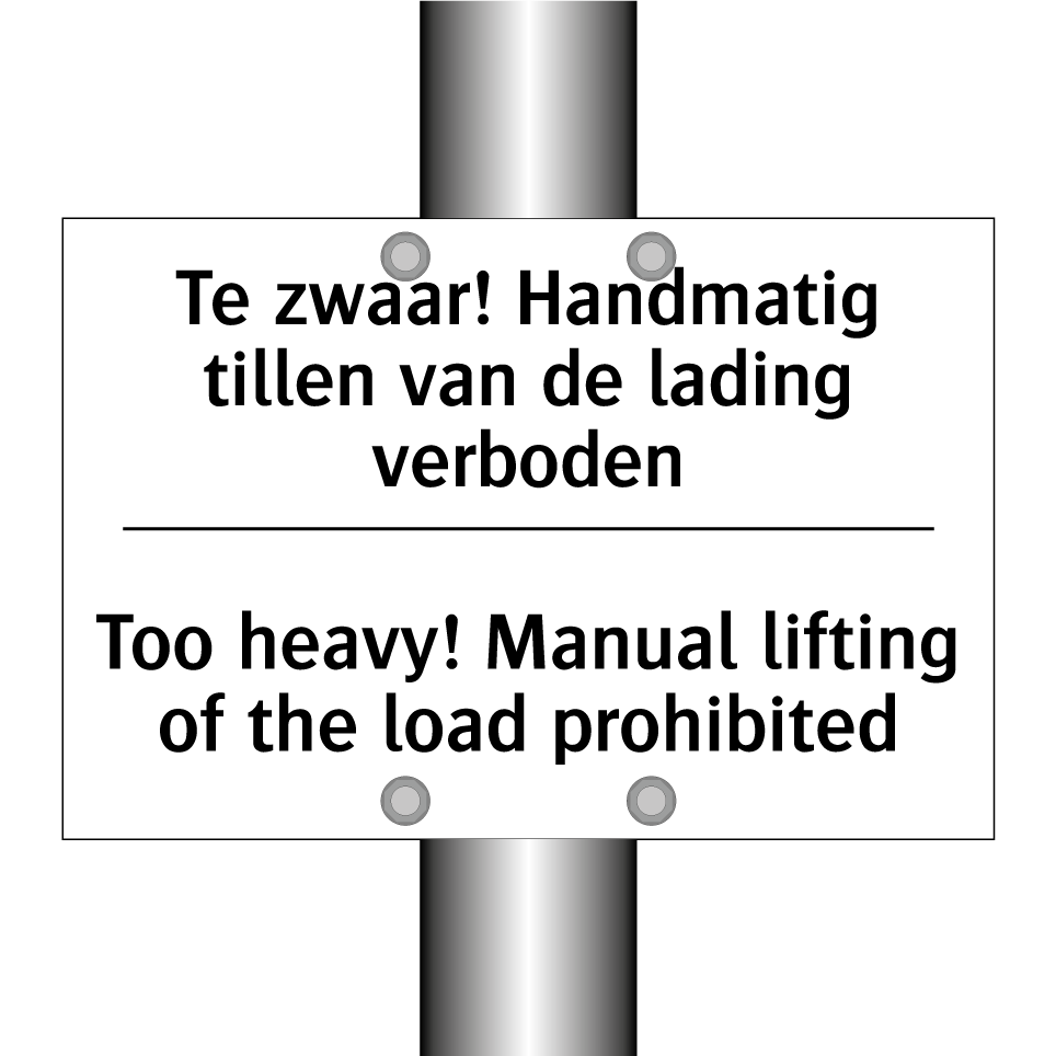 Verbodsbord met de tekst Te zwaar! Handmatig tillen van de lading verboden en in het Engels: Too heavy! Manual lifting of the load prohibited
