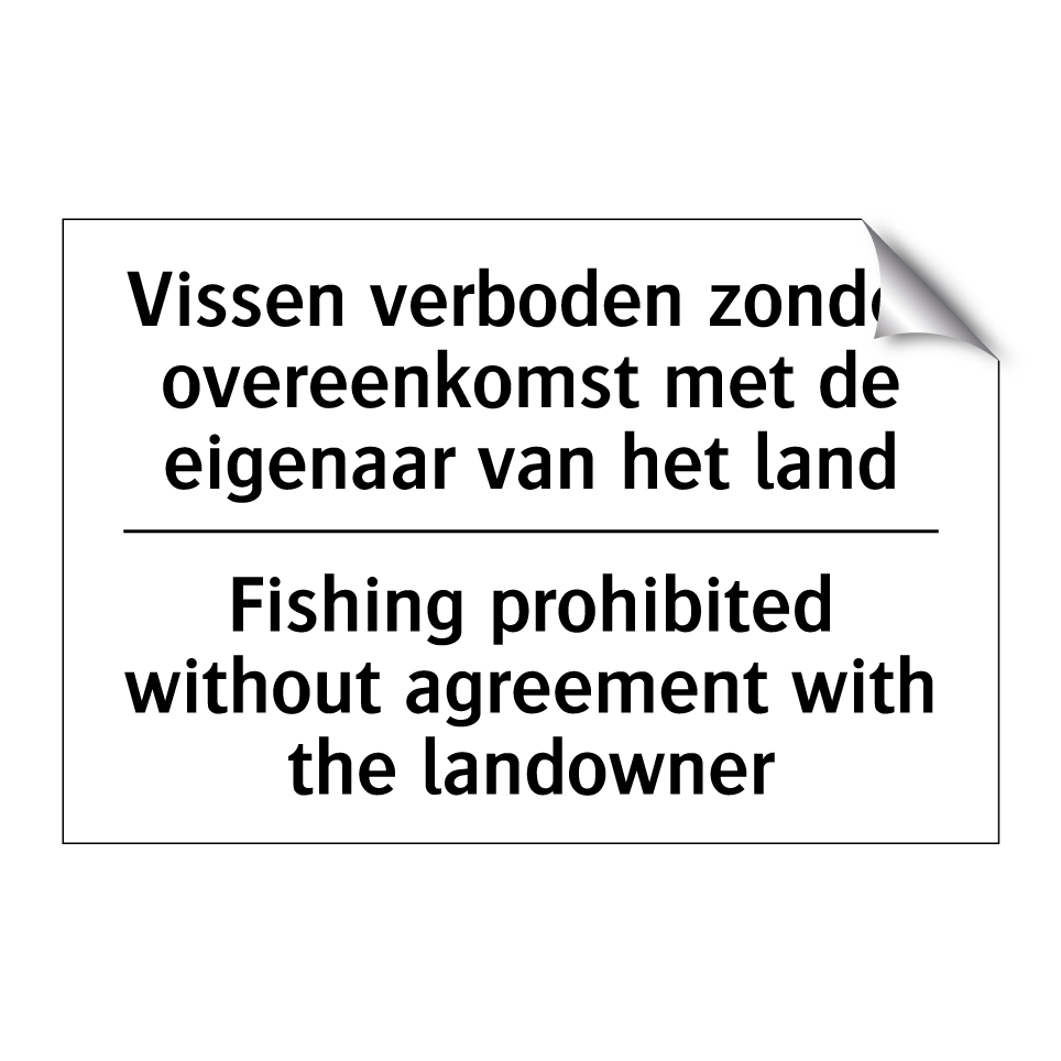 Verbodsbord met de tekst Vissen verboden zonder overeenkomst met de eigenaar van het land en in het Engels: Fishing prohibited without agreement with the landowner