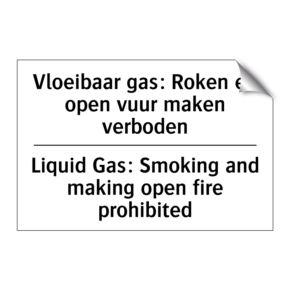 Verbodsbord met de tekst Vloeibaar gas: Roken en open vuur maken verboden en in het Engels: Liquid Gas: Smoking and making open fire prohibited