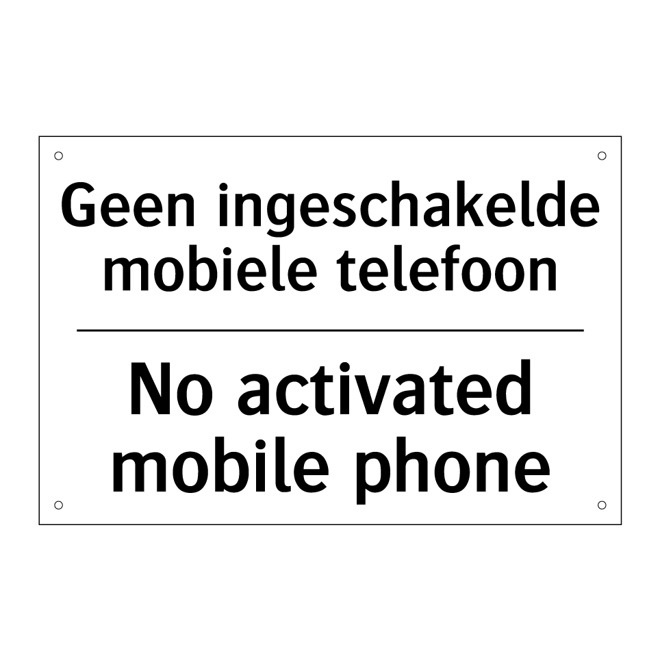 Verbodsbord met de tekst Geen ingeschakelde mobiele telefoon en in het Engels: No activated mobile phone