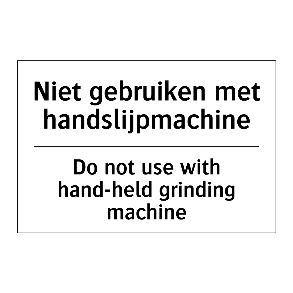 Verbodsbord met de tekst Niet gebruiken met handslijpmachine en in het Engels: Do not use with hand-held grinding machine
