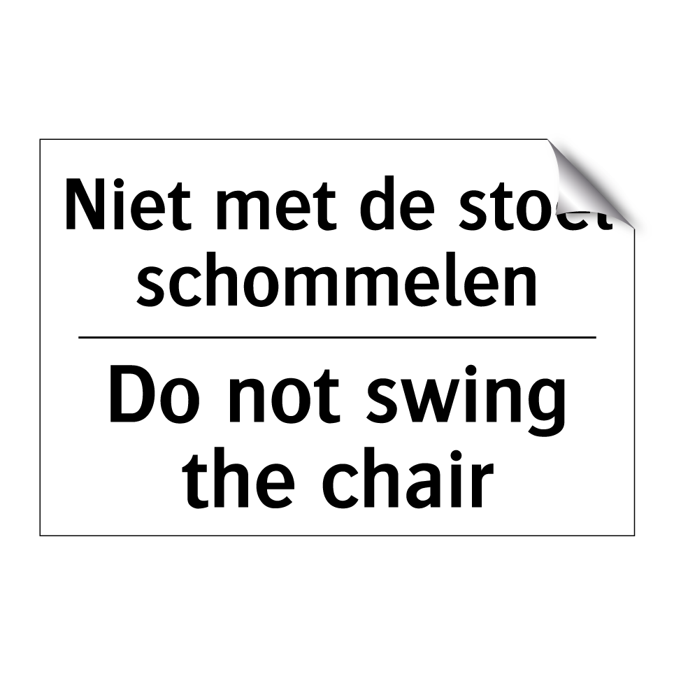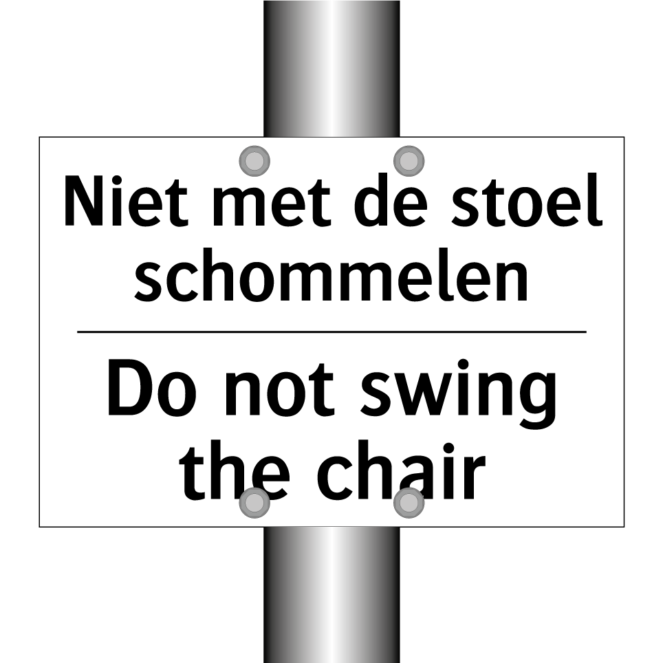 Verbodsbord met de tekst Niet met de stoel schommelen en in het Engels: Do not swing the chair