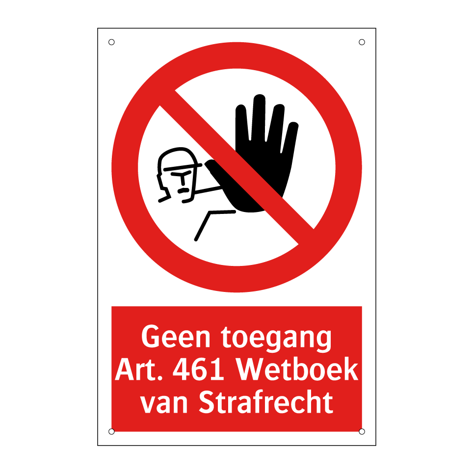 Verbodsbord met de tekst Geen toegang Art. 461 Wetboek van Strafrecht