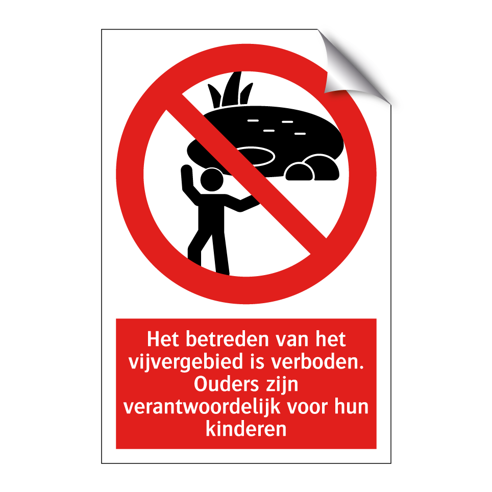 Verbodsbord met de tekst Het betreden van het vijvergebied is verboden. Ouders zijn verantwoordelijk voor hun kinderen