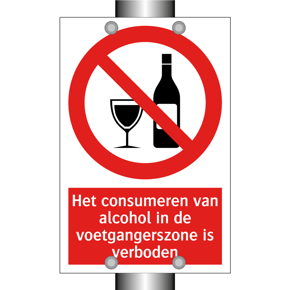 Verbodsbord met de tekst Het consumeren van alcohol in de voetgangerszone is verboden