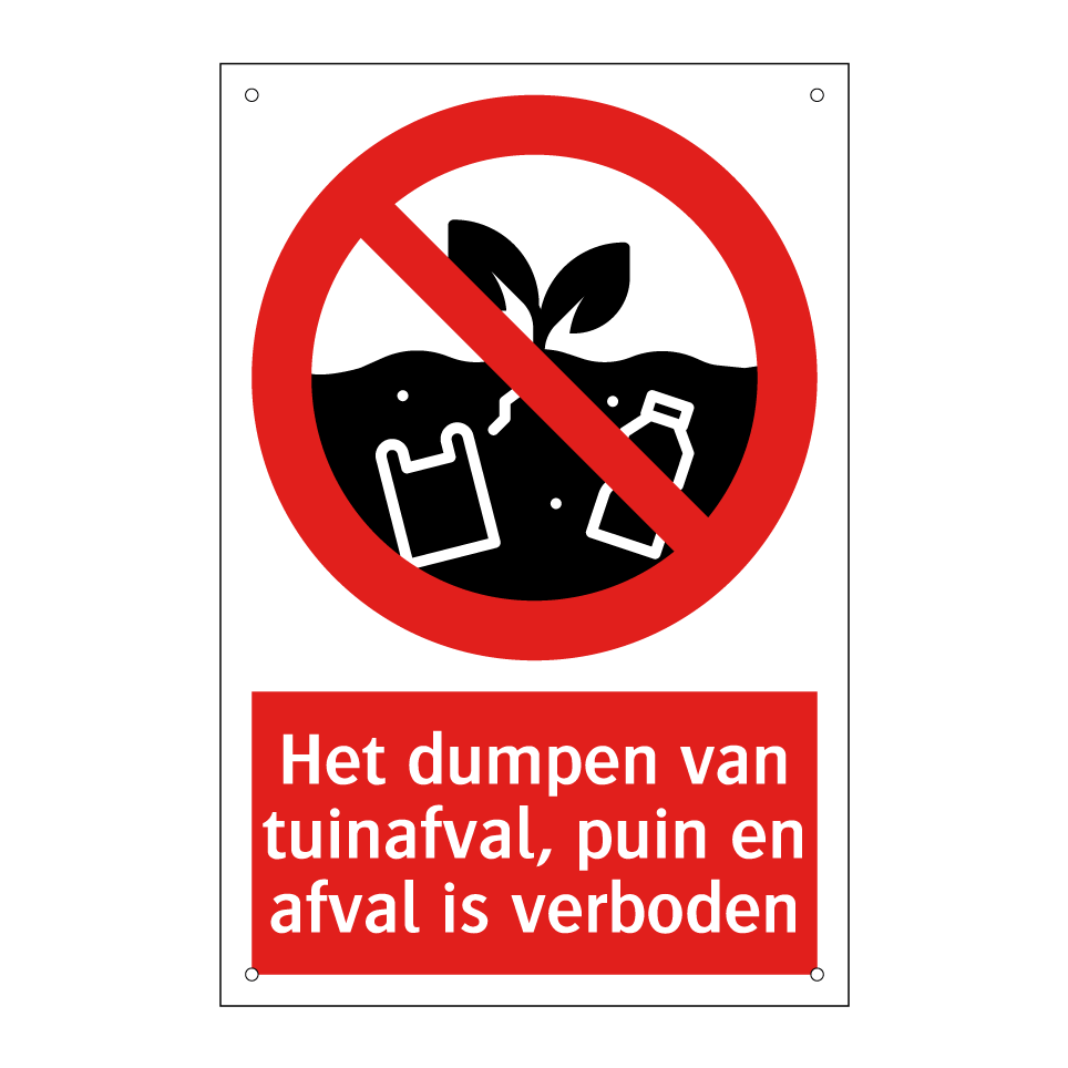 Verbodsbord met de tekst Het dumpen van tuinafval, puin en afval is verboden