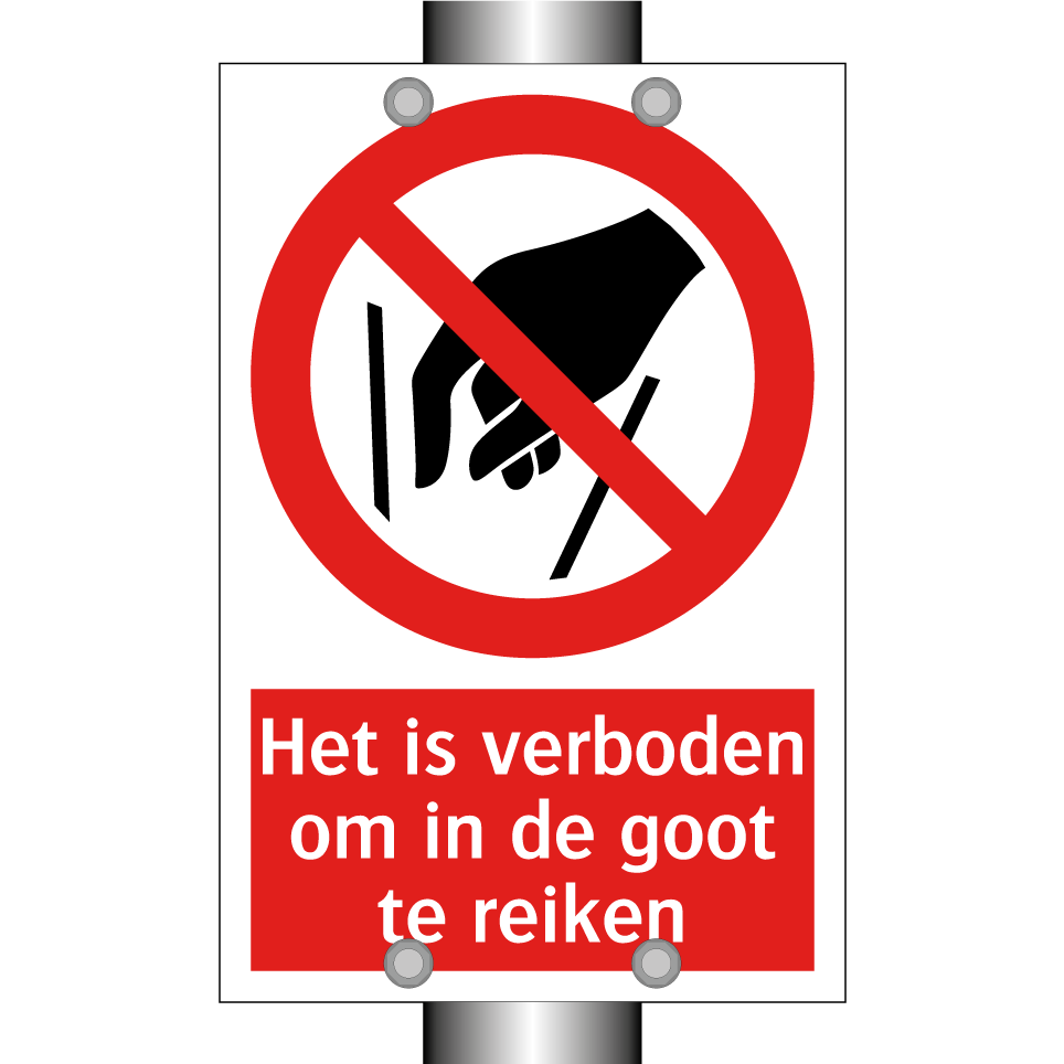 Verbodsbord met de tekst Het is verboden om in de goot te reiken