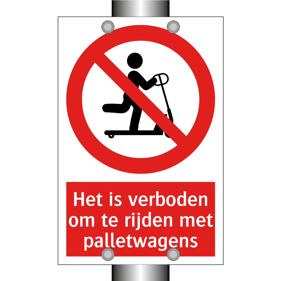 Verbodsbord met de tekst Het is verboden om te rijden met palletwagens