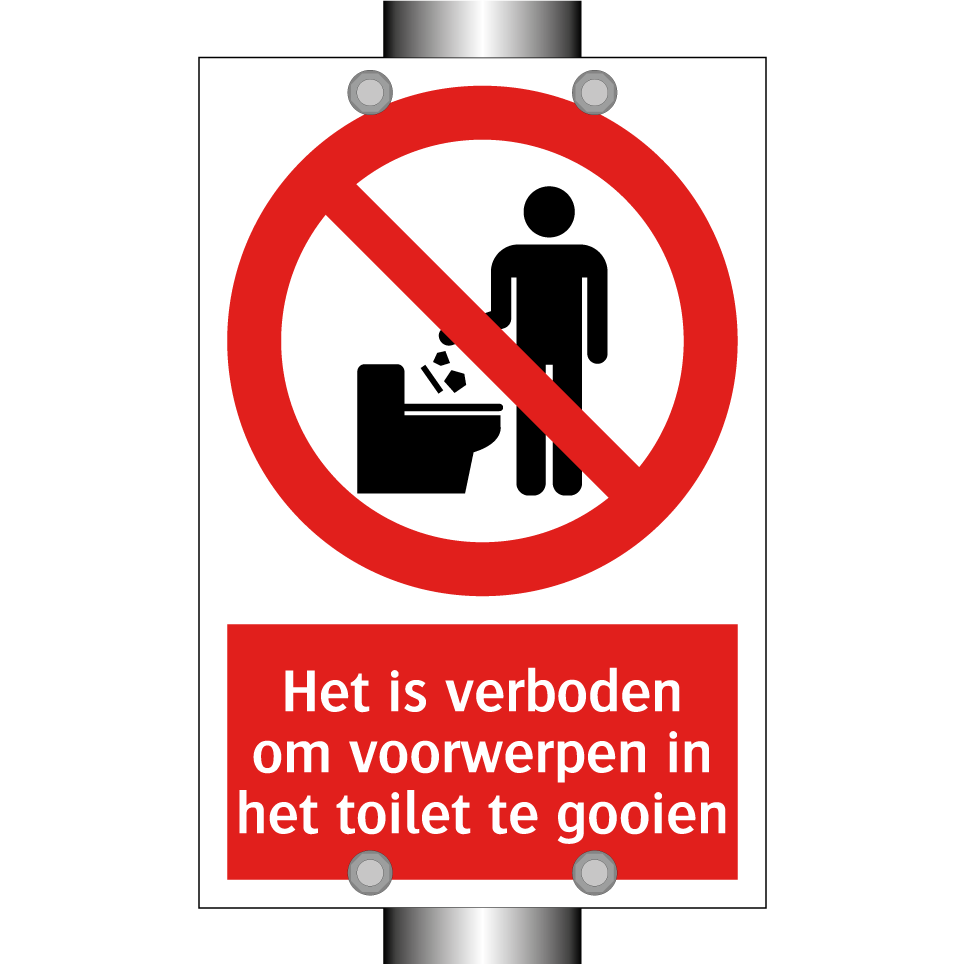 Verbodsbord met de tekst Het is verboden om voorwerpen in het toilet te gooien