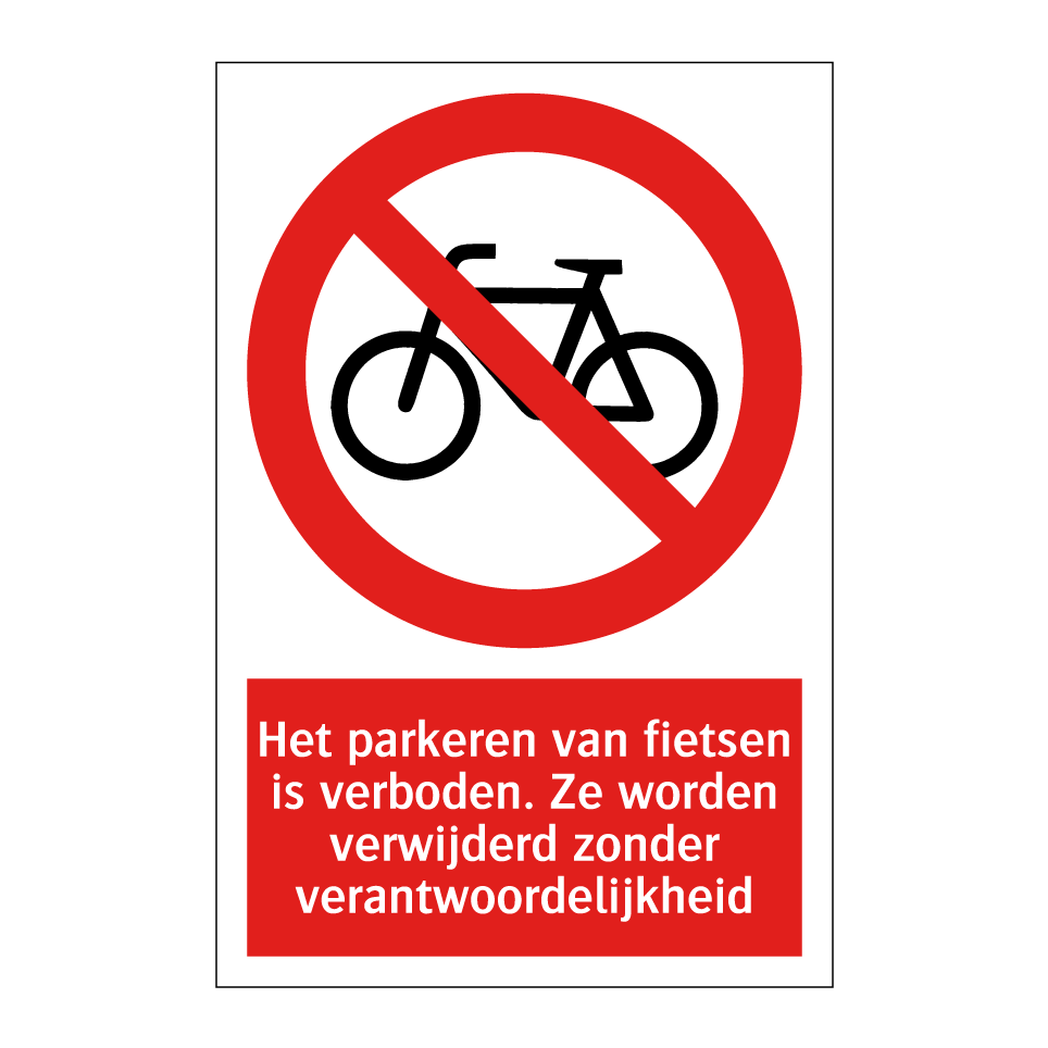 Verbodsbord met de tekst Het parkeren van fietsen is verboden. Ze worden verwijderd zonder verantwoordelijkheid