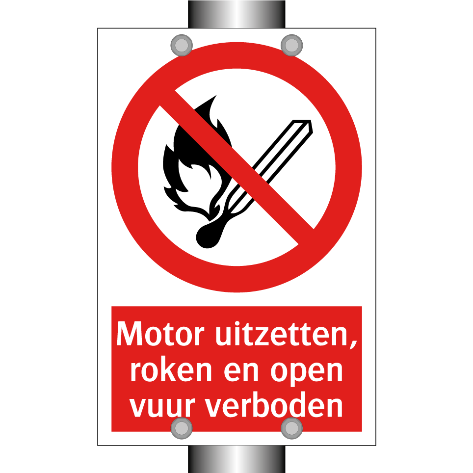 Verbodsbord met de tekst Motor uitzetten, roken en open vuur verboden