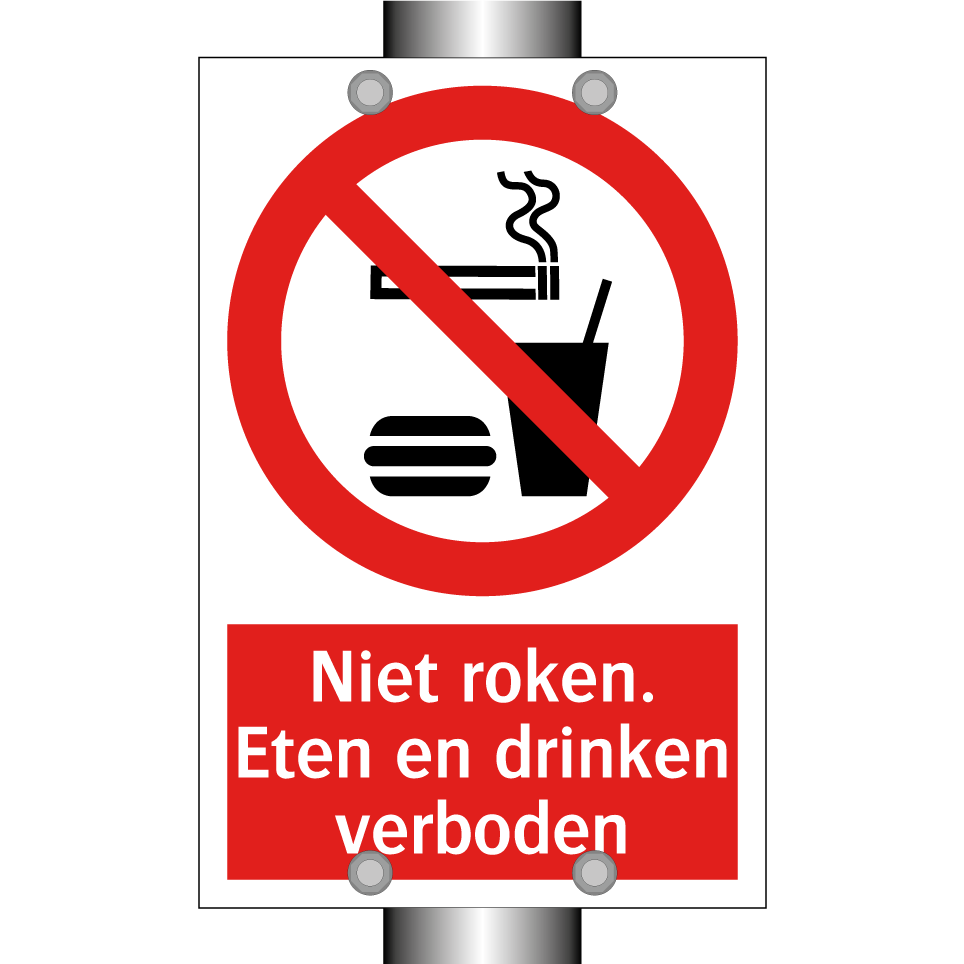 Verbodsbord met de tekst Niet roken. Eten en drinken verboden