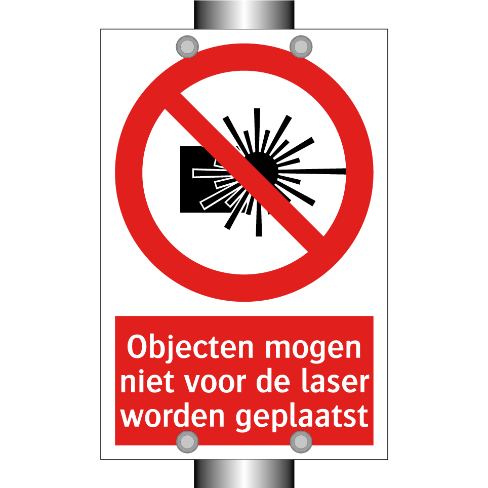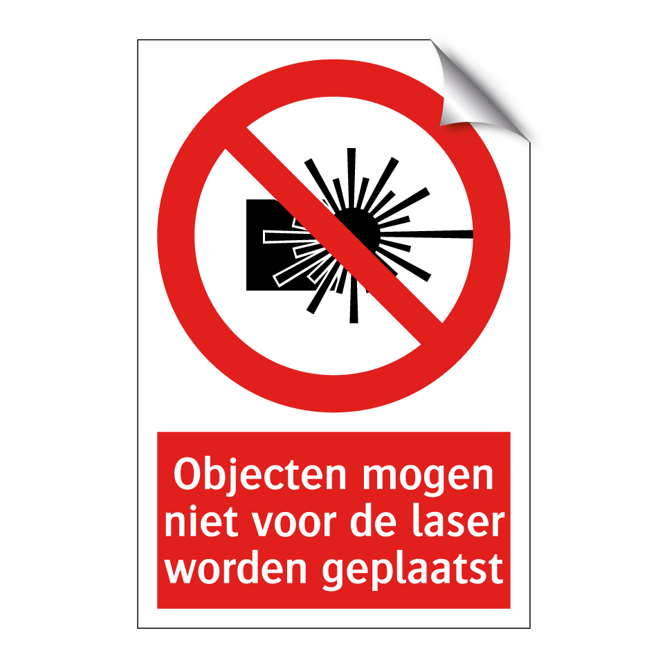 Verbodsbord met de tekst Objecten mogen niet voor de laser worden geplaatst