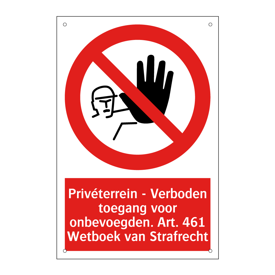 Verbodsbord met de tekst Privéterrein - Verboden toegang voor onbevoegden. Art. 461 Wetboek van Strafrecht