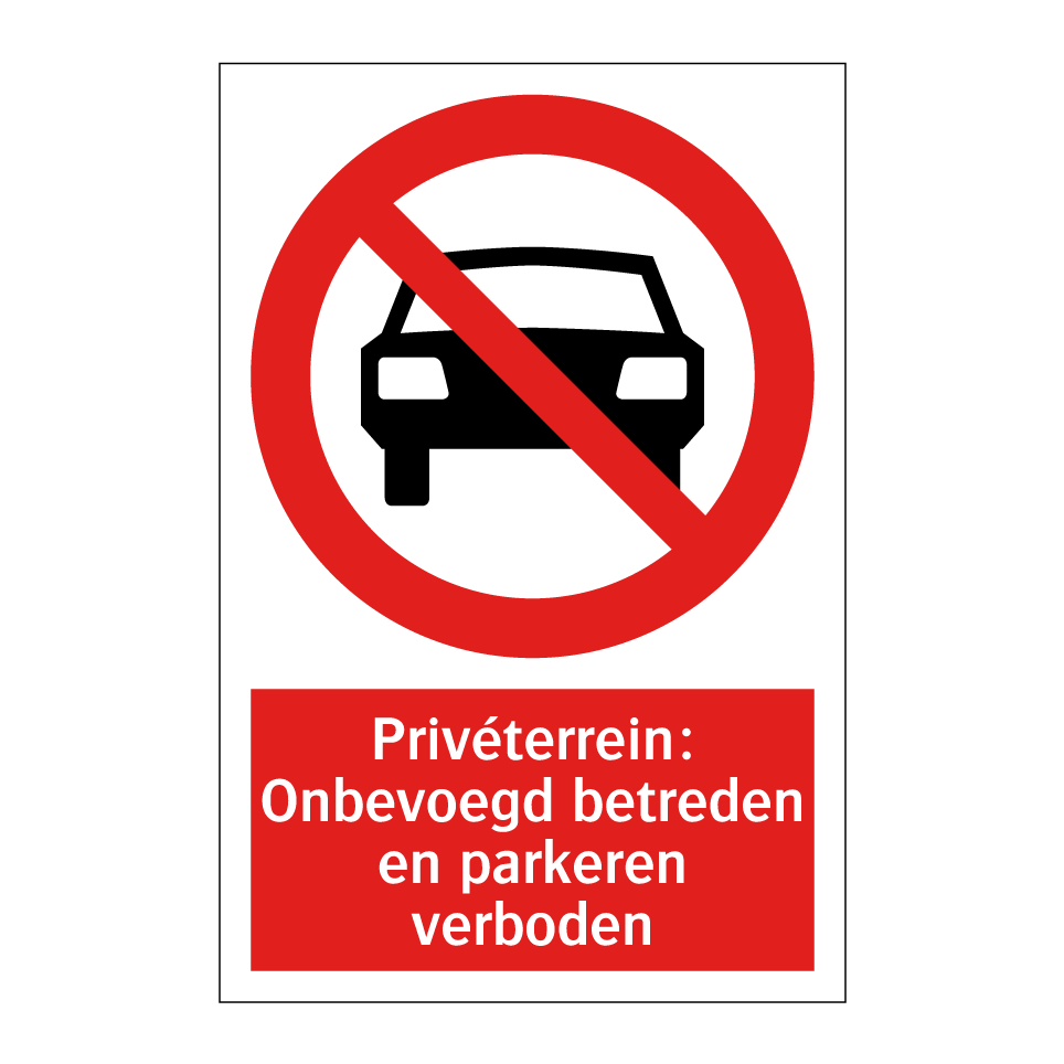 Verbodsbord met de tekst Privéterrein: Onbevoegd betreden en parkeren verboden