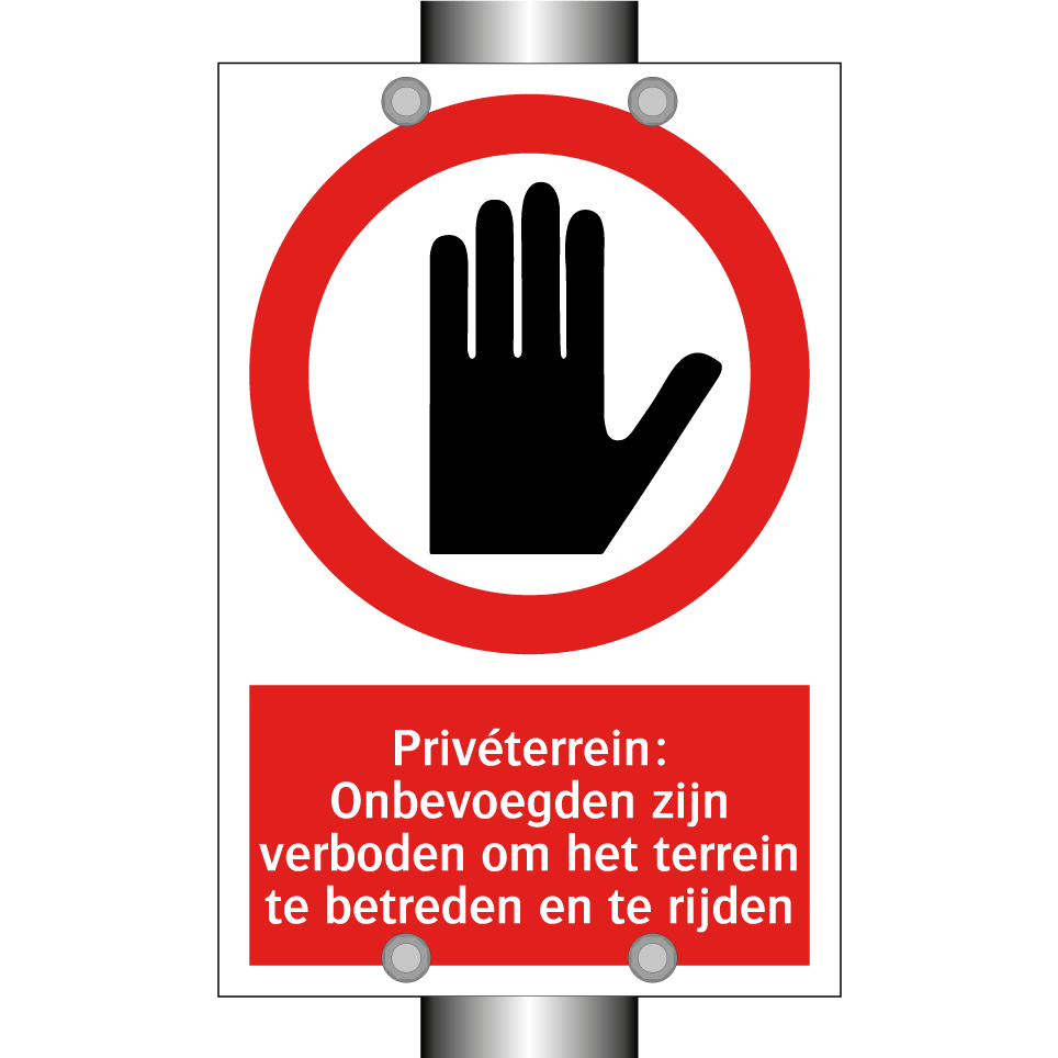 Verbodsbord met de tekst Privéterrein: Onbevoegden zijn verboden om het terrein te betreden en te rijden