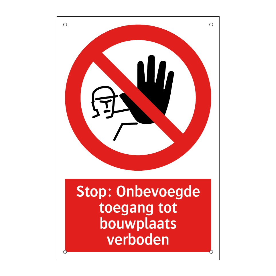 Verbodsbord met de tekst Stop: Onbevoegde toegang tot bouwplaats verboden