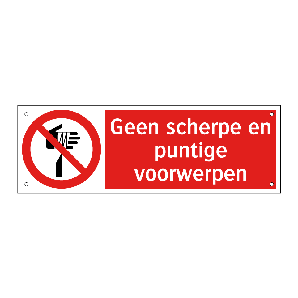 Deze opvallende verbodsbord is essentieel voor het waarborgen van de veiligheid in diverse omgevingen. Het bord is ideaal voor gebruik in gebieden waar scherpe en puntige voorwerpen een risico kunnen vormen, zoals werkplaatsen, magazijnen en openbare ruimtes. Door de duidelijke rode achtergrond en witte tekst met een herkenbaar symbool, trekt het onmiddellijk de aandacht en communiceert het effectief het verbod. Plaats dit bord op strategische locaties zoals ingangen, gangen of nabij machines om ervoor te zorgen dat iedereen op de hoogte is van de veiligheidsvoorschriften. Dit verbodsbord helpt bij het minimaliseren van ongelukken en bevordert een veilige omgeving.