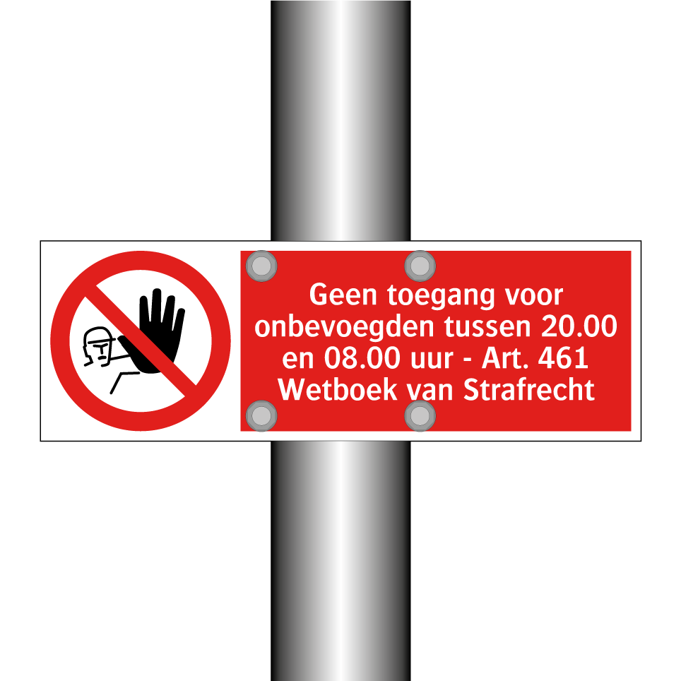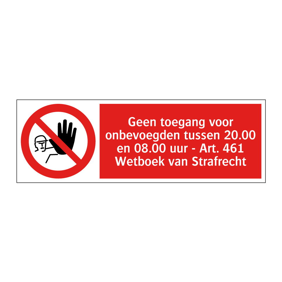 Verbodsbord met de tekst Geen toegang voor onbevoegden tussen 20.00 en 08.00 uur - Art. 461 Wetboek van Strafrecht
