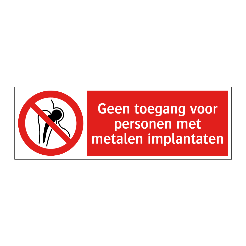 Verbodsbord met de tekst Geen toegang voor personen met metalen implantaten