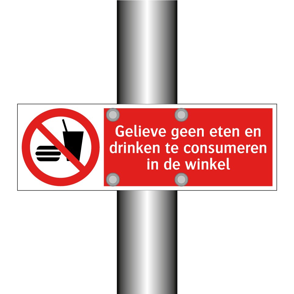 Verbodsbord met de tekst Gelieve geen eten en drinken te consumeren in de winkel