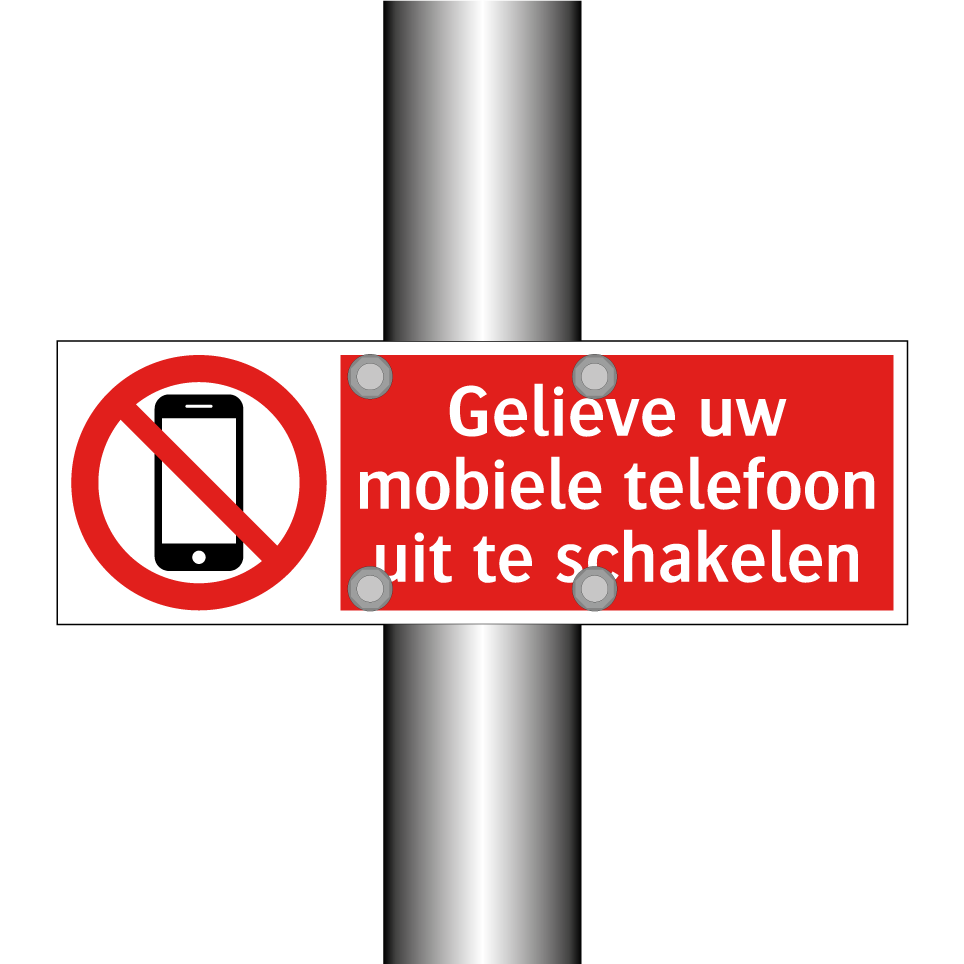 Verbodsbord met de tekst Gelieve uw mobiele telefoon uit te schakelen