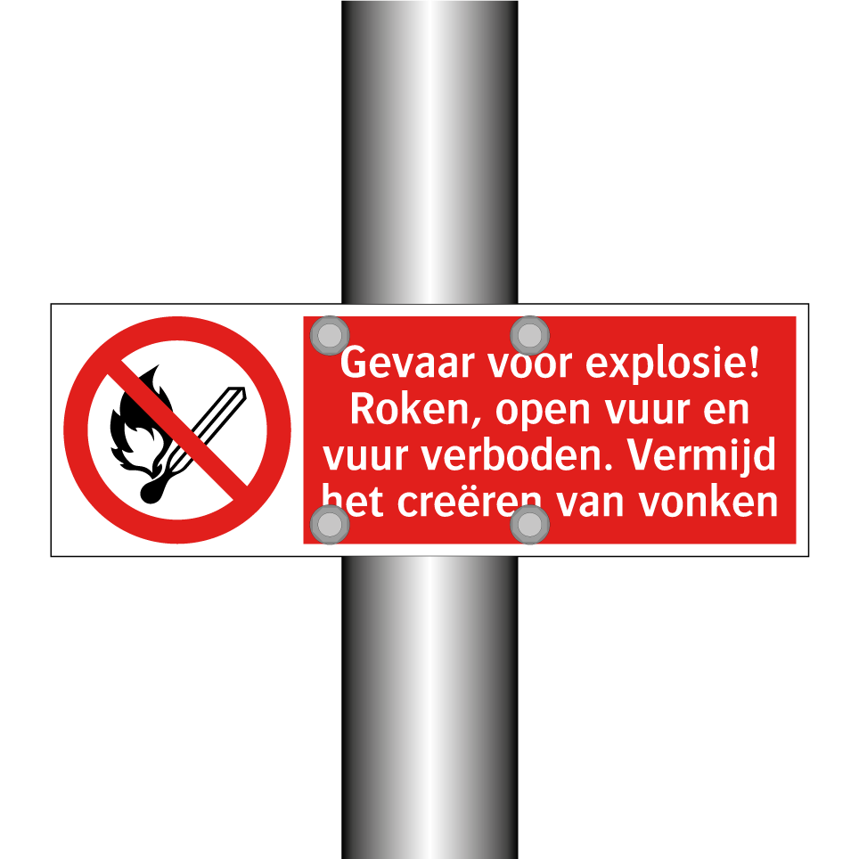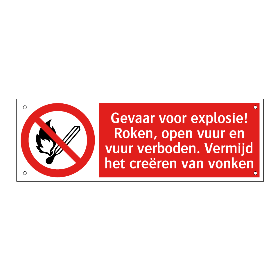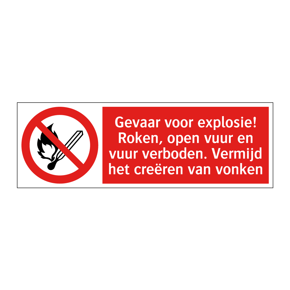 Verbodsbord met de tekst Gevaar voor explosie! Roken, open vuur en vuur verboden. Vermijd het creëren van vonken