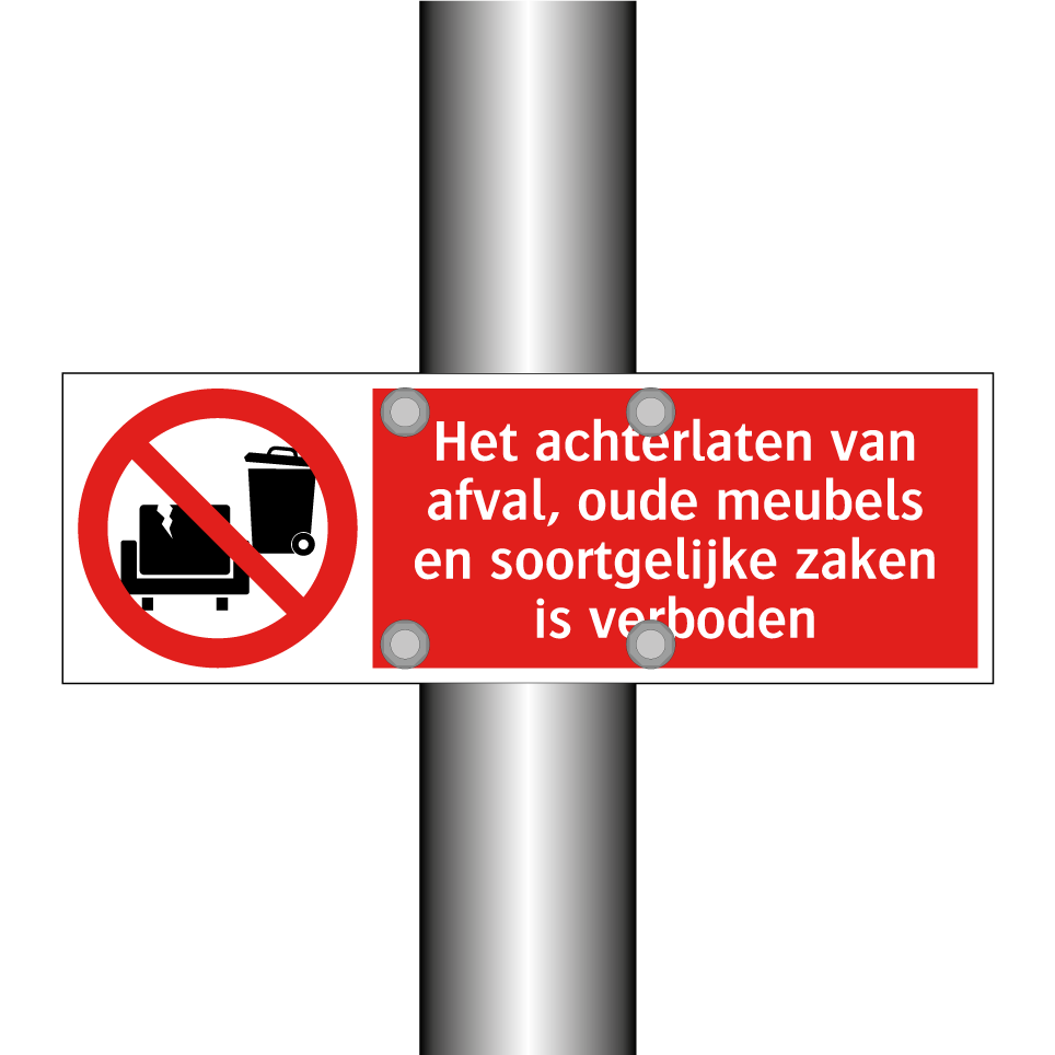 Verbodsbord met de tekst Het achterlaten van afval, oude meubels en soortgelijke zaken is verboden
