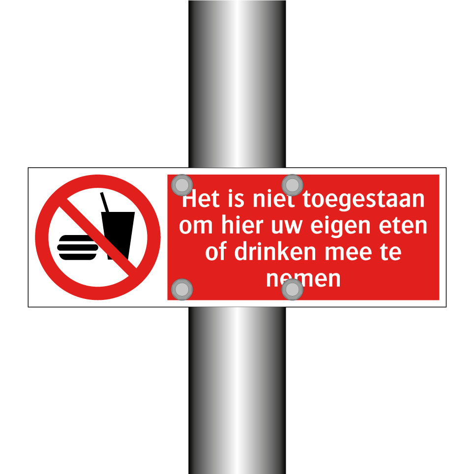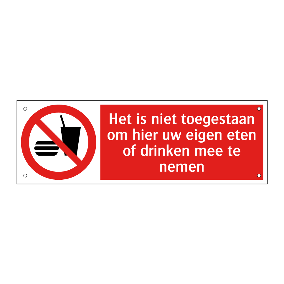 Verbodsbord met de tekst Het is niet toegestaan om hier uw eigen eten of drinken mee te nemen
