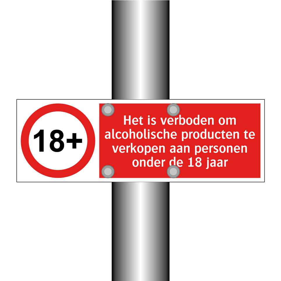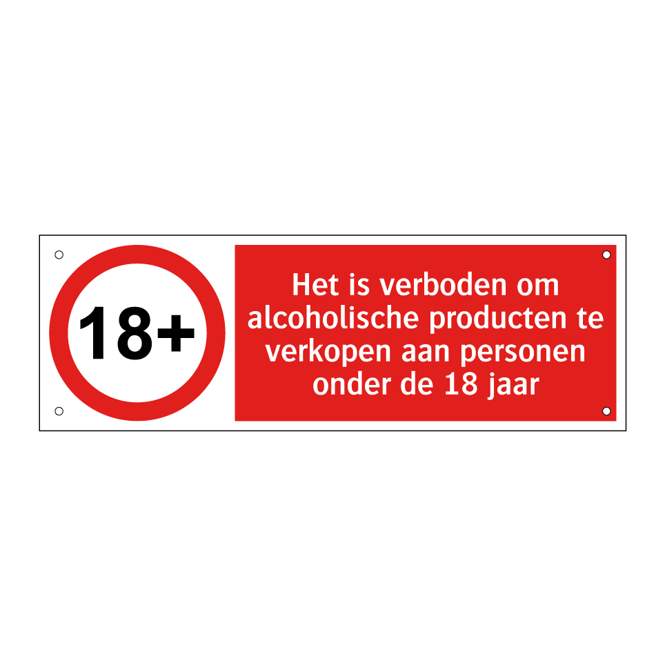 Verbodsbord met de tekst Het is verboden om alcoholische producten te verkopen aan personen onder de 18 jaar