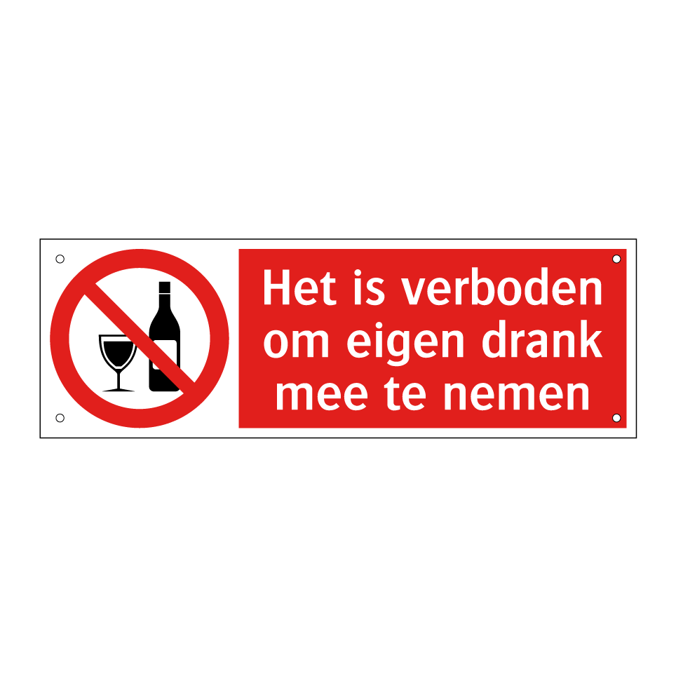 Deze opvallende verbodsbord is ideaal voor gebruik op locaties waar het belangrijk is om duidelijk te maken dat het niet toegestaan is om eigen drank mee te nemen. Denk aan evenementen, horecagelegenheden of andere openbare ruimtes waar het handhaven van deze regel essentieel is. De rode achtergrond en witte tekst zorgen ervoor dat de boodschap direct opvalt en begrepen wordt. Plaats deze verbodsbord bij ingangen, in wachtruimtes of op andere strategische plekken om ervoor te zorgen dat bezoekers zich bewust zijn van de regels. Deze bord is een effectieve manier om ongewenst gedrag te voorkomen en de orde te handhaven.