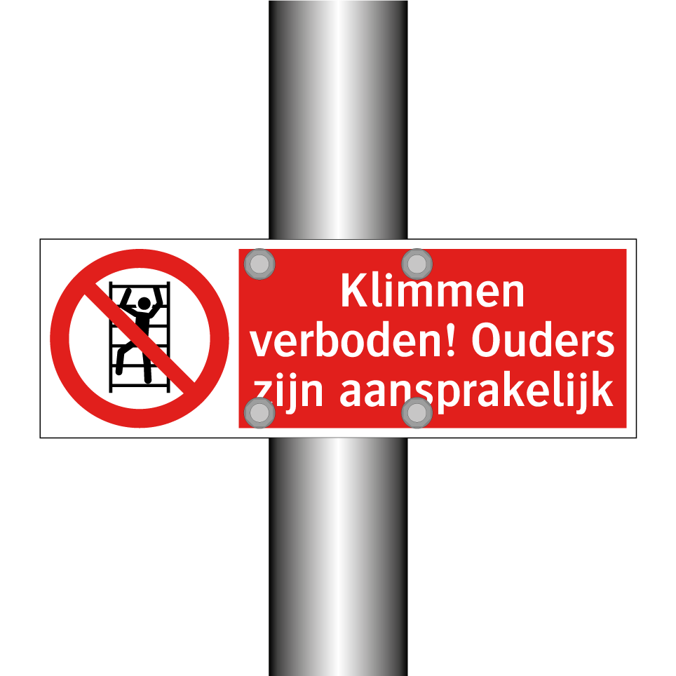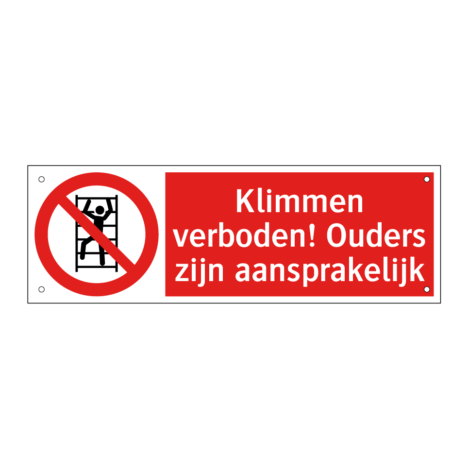 Verbodsbord met de tekst Klimmen verboden! Ouders zijn aansprakelijk