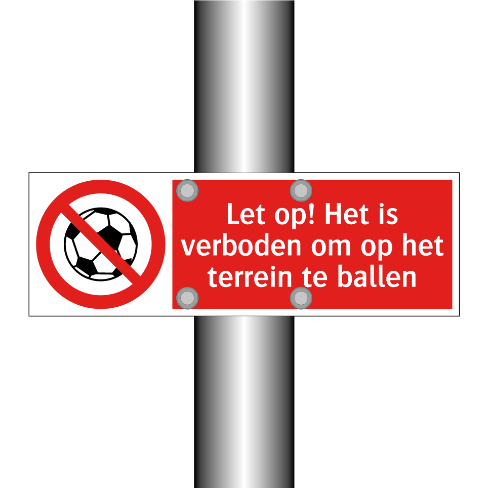 Verbodsbord met de tekst Let op! Het is verboden om op het terrein te ballen