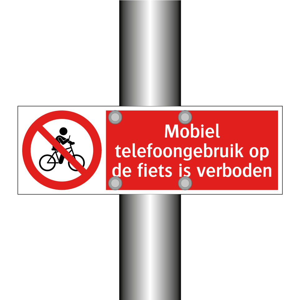 Verbodsbord met de tekst Mobiel telefoongebruik op de fiets is verboden