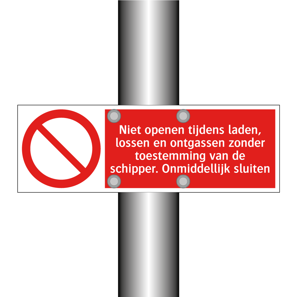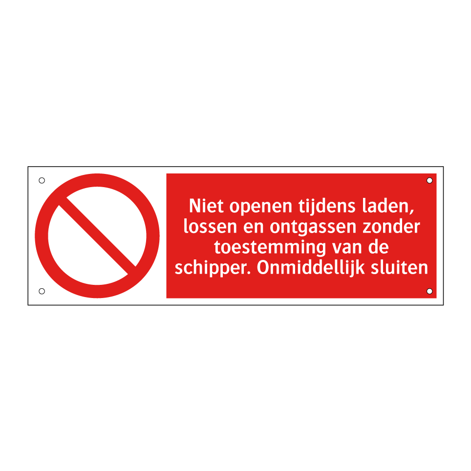 Verbodsbord met de tekst Niet openen tijdens laden, lossen en ontgassen zonder toestemming van de schipper. Onmiddellijk sluiten