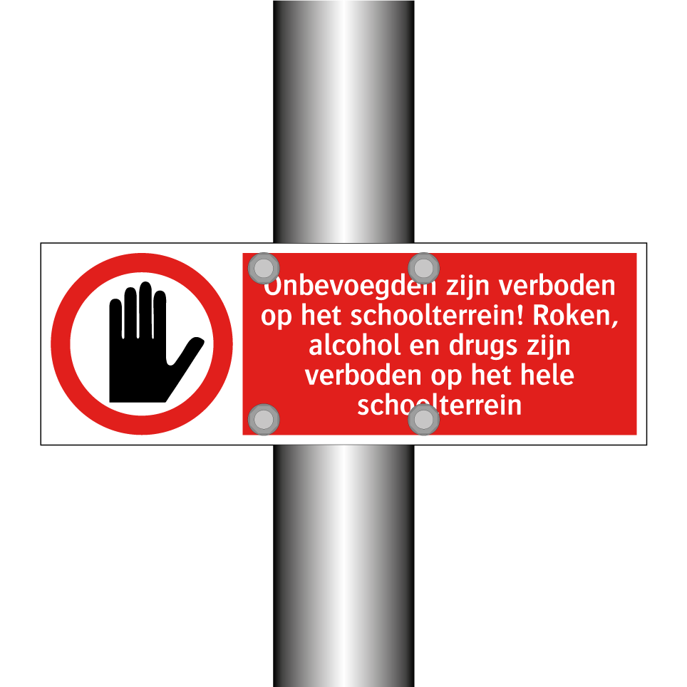 Verbodsbord met de tekst Onbevoegden zijn verboden op het schoolterrein! Roken, alcohol en drugs zijn verboden op het hele schoolterrein