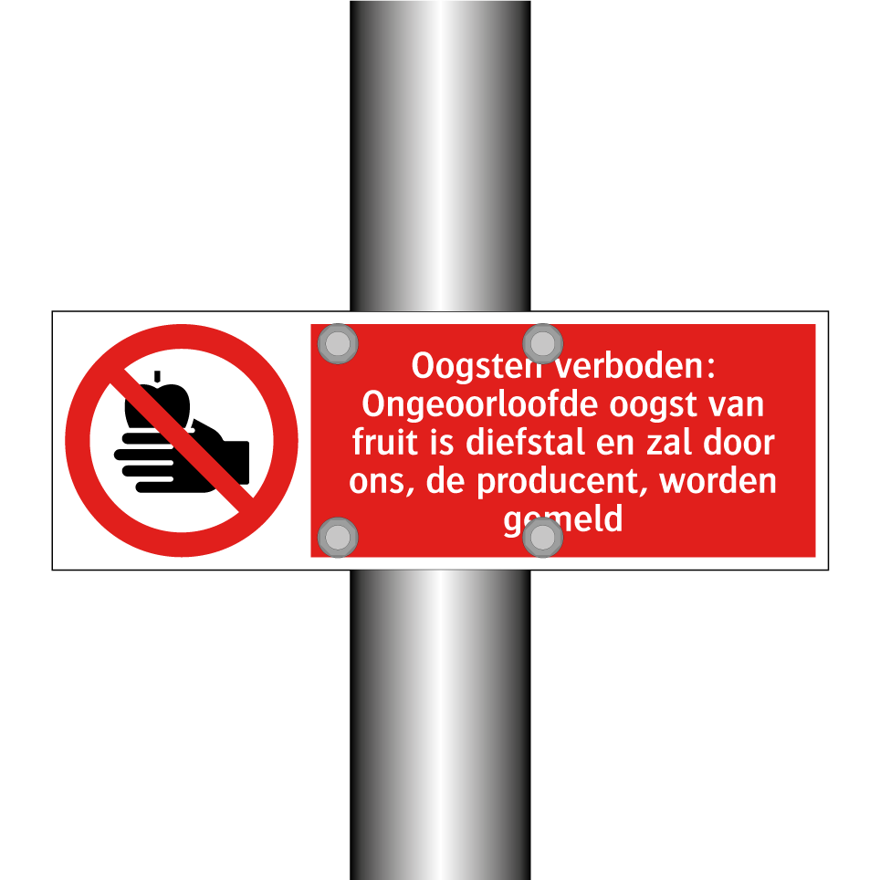 Verbodsbord met de tekst Oogsten verboden: Ongeoorloofde oogst van fruit is diefstal en zal door ons, de producent, worden gemeld