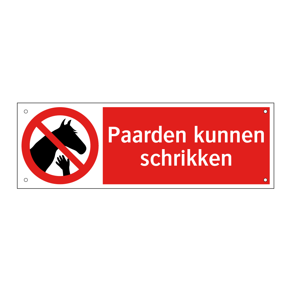 Deze opvallende verbodsbord is essentieel voor het waarborgen van de veiligheid in gebieden waar paarden aanwezig zijn. Het waarschuwt voorbijgangers en automobilisten om voorzichtig te zijn, aangezien paarden onverwacht kunnen reageren op plotselinge bewegingen of geluiden. Ideaal voor gebruik bij maneges, ruiterpaden, en landelijke wegen, helpt dit bord om ongelukken te voorkomen door mensen bewust te maken van de mogelijke gevaren. Door de duidelijke rode achtergrond en witte tekst is het bord goed zichtbaar, zelfs van een afstand. Plaats het op strategische locaties waar interactie met paarden waarschijnlijk is, om de veiligheid van zowel dieren als mensen te bevorderen.