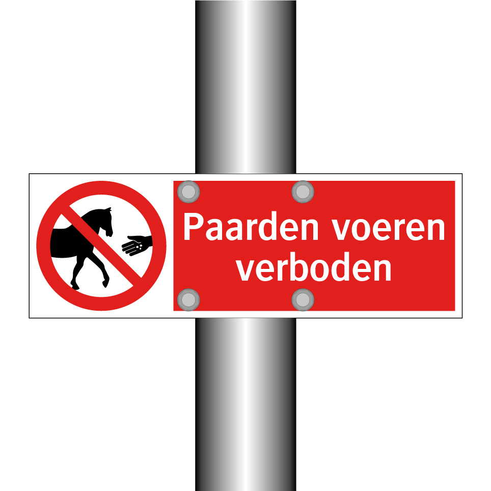 Dit verbodsbord is een essentieel hulpmiddel voor het handhaven van regels op plekken waar dieren aanwezig zijn. Het bord is ideaal voor gebruik in dierentuinen, maneges, kinderboerderijen en andere locaties waar paarden worden gehouden. Door de duidelijke rode achtergrond en witte tekst trekt het onmiddellijk de aandacht van bezoekers en voorkomt het ongewenst voeren van paarden. Plaats het bord op strategische plekken zoals ingangen, langs wandelpaden of bij stallen om ervoor te zorgen dat de boodschap niet over het hoofd wordt gezien. Dit verbodsbord helpt bij het beschermen van de gezondheid van de dieren en het bevorderen van verantwoord gedrag bij bezoekers.